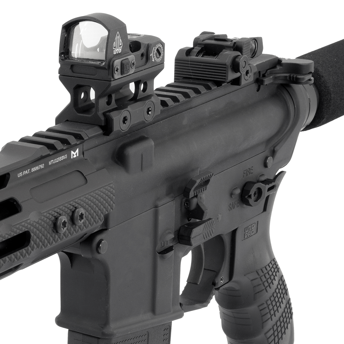 La conception élargie et striée de l'arrêtoir de culasse, fait qu'il tombe instinctivement sous la main du tireur, afin d'accélérer les manipulations d'arme lors des réapprovisionnements.