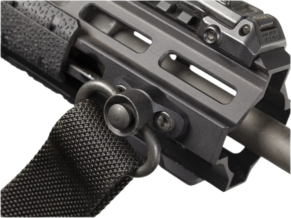 Le support de sangle M-LOK QD offre un point d'attache avant pour la sangle Magpul MS4 et autres sangles QD à bouton-poussoir. Fabriqué en acier robuste avec une finition au nitrure de sel QPQ pour une résistance extrême à l'usure et à la corrosion, le support de sangle M-LOK QD à profil bas présente des bords biseautés pour réduire les accrochages et une conception anti-rotation qui empêche les émerillons de tourner.