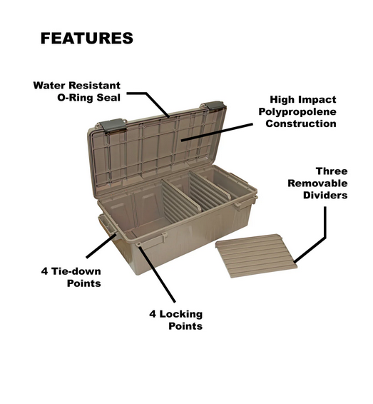 La nouvelle caisse à munitions compartimentée de MTM allie la robustesse des autres caisses à munitions MTM de référence à la capacité et à la division de quatre canettes de calibre 30 sous un seul couvercle. L'intérieur spacieux de l'ACDC30 est doté de trois compartiments amovibles pour de nombreuses options de rangement. Organisez votre équipement grâce aux quatre compartiments ou retirez complètement les compartiments pour les articles mesurant jusqu'à 44,5 cm de long. Conçue pour un rangement empilable, l'ACDC30 s'intègre parfaitement aux cinq autres caisses à munitions utilitaires de MTM.