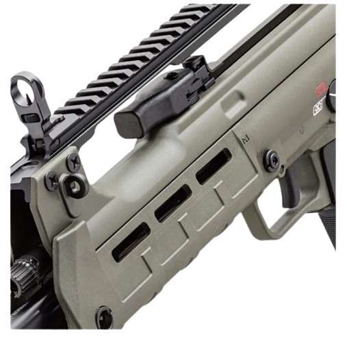 - Arrêtoir de culasse, sélecteur de tir et bouton de chargeur ambidextre,