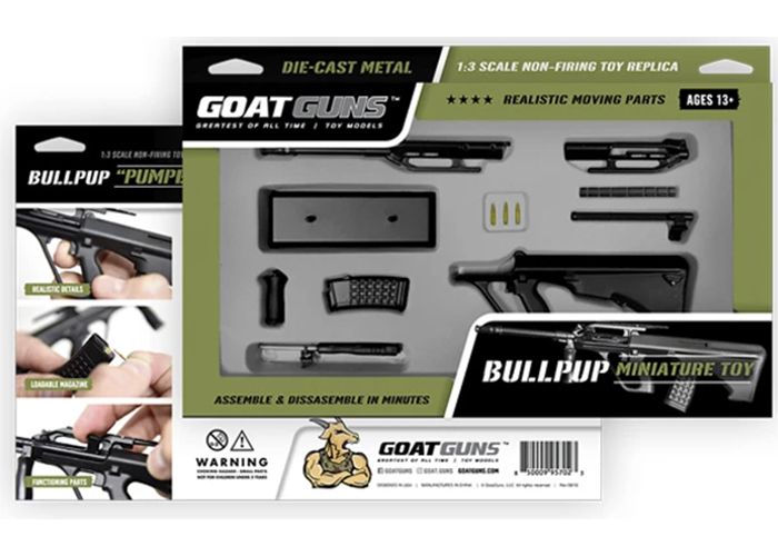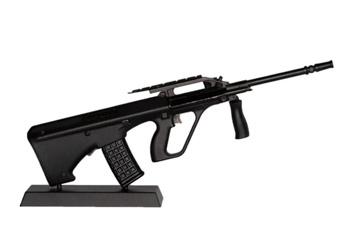 Le Mini Steyr AUG Bullpup Black de Goatguns est une réplique miniature qui reproduit fidèlement toutes les caractéristiques de son homologue réel, à l'échelle 1:3.