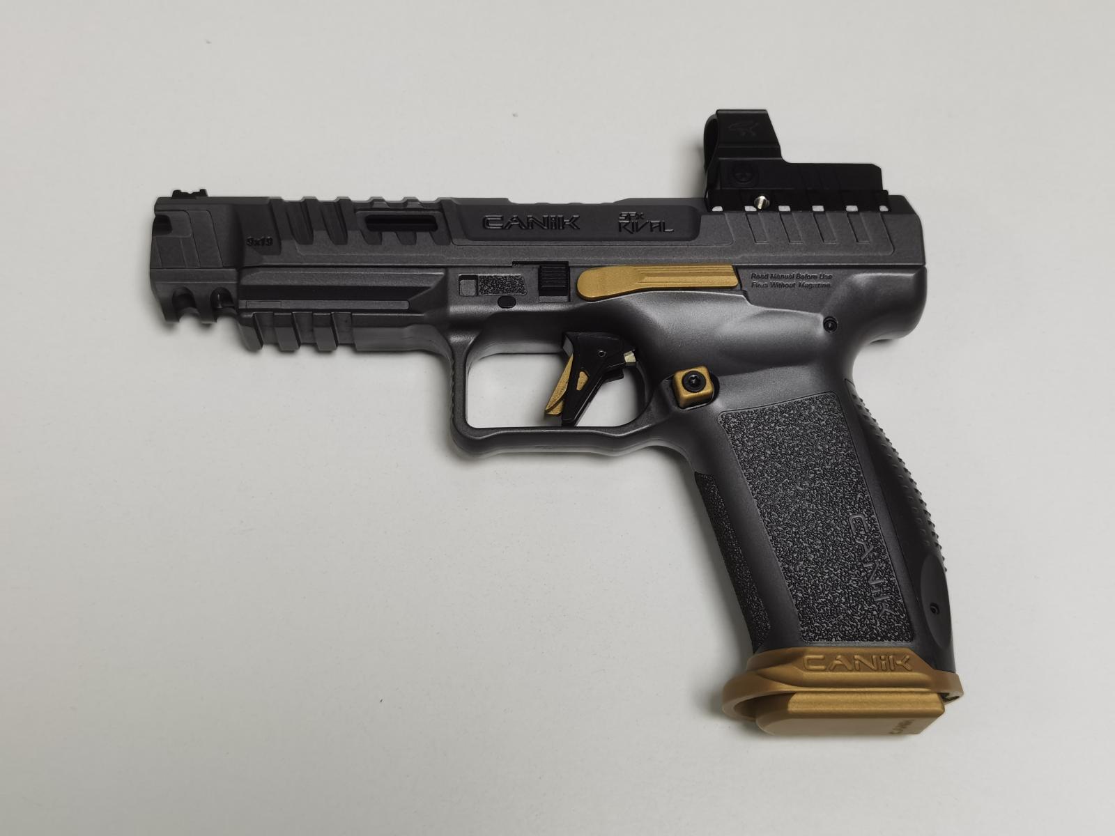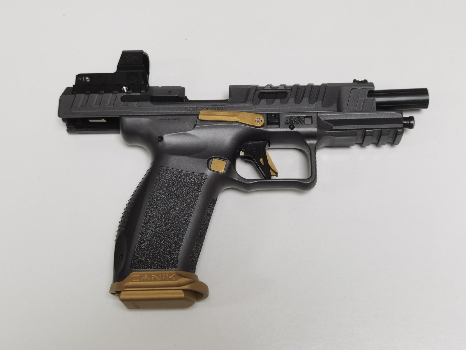 Aucun autre nom ne pouvait exprimer aussi clairement ce design. Un modèle supérieur, capable de rivaliser avec tous les autres pistolets, fait désormais son entrée sur le marché. Doté de caractéristiques spécialement conçues pour devancer la concurrence, comme une queue de castor améliorée, des dentelures de culasse avant agressives, un angle de pontet plus prononcé, un nouveau système de verrouillage de l'étui (HFL) et un nouveau boîtier de chargeur auto-évasé. Grâce à ce nouveau boîtier, équipé d'une hausse réglable et d'un guidon à fibre optique, la maniabilité et l'acquisition de la cible du pistolet sont considérablement améliorées. Le SFx RIVAL est doté d'un boîtier modulaire facilitant le démontage de l'arme. Grâce à cette conception, l'utilisateur peut démonter son pistolet d'origine jusqu'à ses plus petites pièces, puis le remonter à l'aide du simple outil de poinçonnage CANiK. CANiK continue d'utiliser la technologie la plus avancée au monde en matière de conception de détente pour développer la détente en aluminium allégé, taillée au diamant et à 90° du SFx RIVAL. Associée à une distance de préréglage et de réinitialisation raccourcie, elle améliore la vitesse et la précision. Outre ces améliorations techniques, des considérations esthétiques ont également été prises en compte lors de la conception du RIVAL : avec un revêtement unique, le Canik Rival Grey, créé par Cerakote en exclusivité pour CANiK, appliqué sur le cadre et la culasse, et de l'or H122 sur la détente, le loquet de déverrouillage du chargeur, la plaque de base du chargeur, le puits de chargeur et le levier d'arrêt de culasse, cette arme à feu fera sensation sur tous les stands de tir.