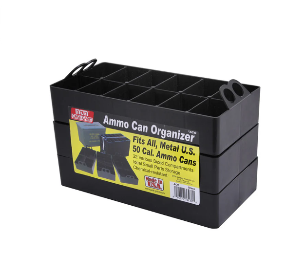 Un ensemble de 3 plateaux de rangement en plastique transforme n'importe quelle boîte à munitions de calibre .50, en métal ou en plastique, en un organiseur à 22 compartiments. Ces plateaux empilables s'adaptent parfaitement aux boîtes à munitions métalliques standard de calibre .50. Chaque plateau est muni de 2 poignées pour faciliter son retrait. Les poignées se replient pour un rangement aisé. Fabriqués en polypropylène durable, ils résistent à l'huile et à la graisse. Lot de 3 plateaux (boîte à munitions non incluse).