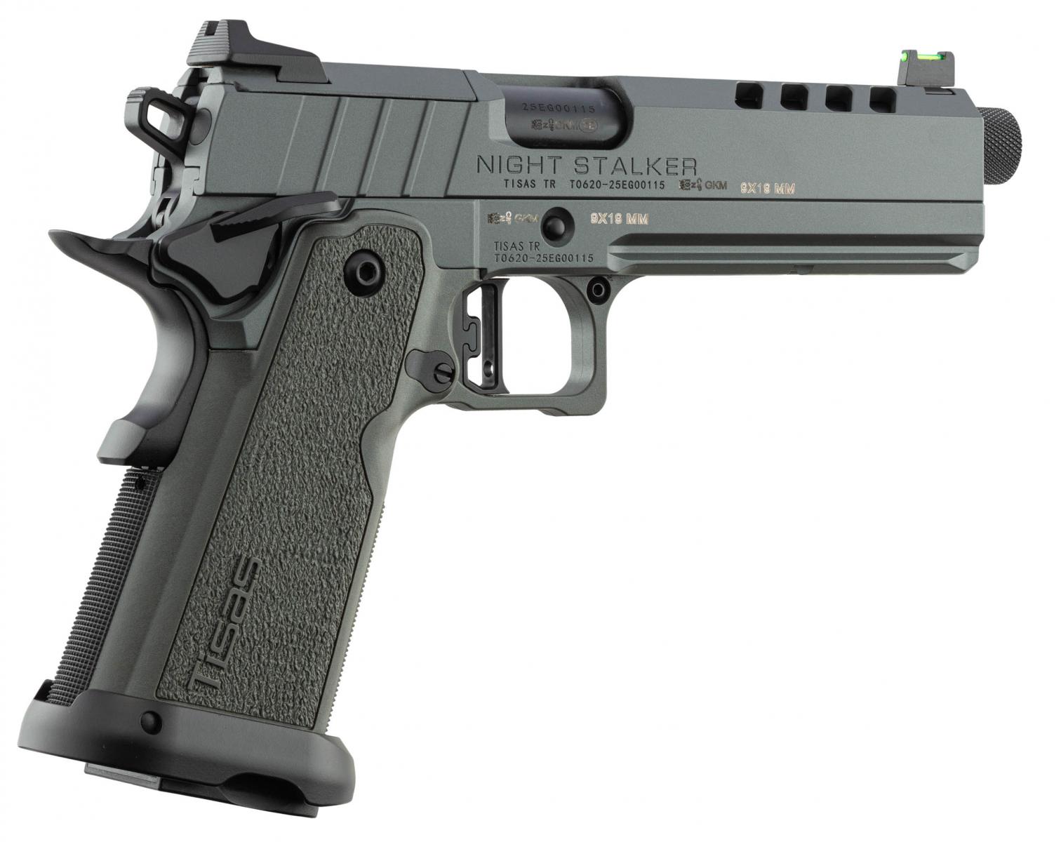 Le pistolet Tisas 2011 Night Stalker offre une carcasse full frame avec rail Picatinny intégré, garantissant une excellente stabilité et la possibilité de monter une lampe ou un laser. Le grip texturé en polymère assure une tenue ferme et confortable, même lors de longues séances au stand.
