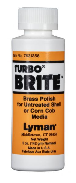 Le produit de polissage pour laiton Turbo Brite est idéal comme additif pour les granulés de maïs ou les coquilles de noix non traités. Il est également efficace avec les granulés traités pour redonner au laiton un brillant éclatant. Faites briller vos douilles en laiton avec le produit de polissage Turbo Brite de Lyman.