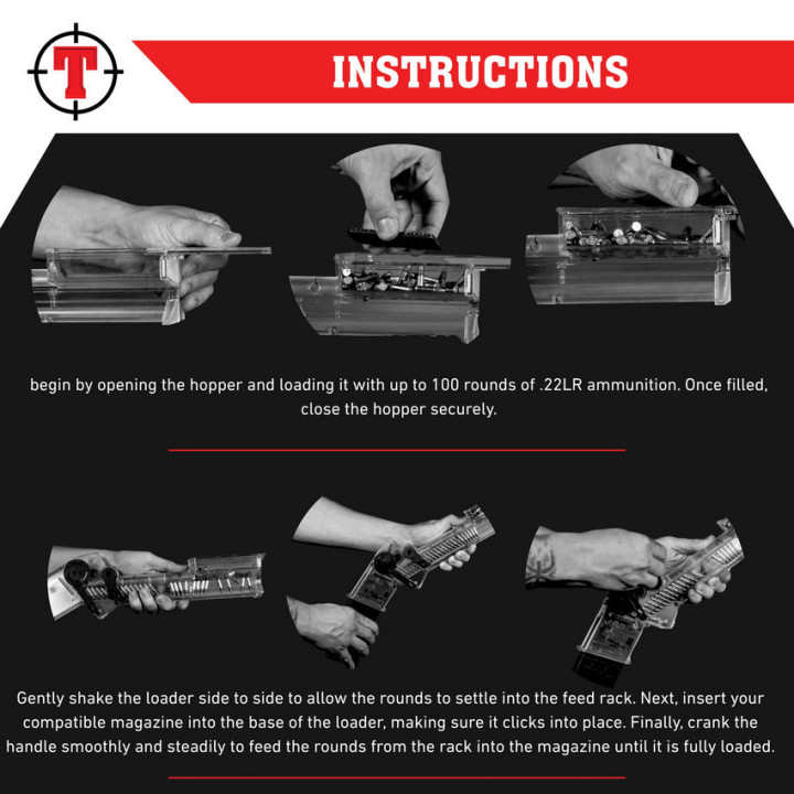 Le chargeur rapide Tippmann Arms remplit vos chargeurs en quelques secondes, à chaque fois. Compatible avec les chargeurs Tippmann Arms M4-22, il fonctionne également avec les chargeurs M&P® 15-22, Rock River Arms et Black Dog X-Form. Remplissez simplement le réservoir avec 50 à 100 cartouches de vos munitions .22LR préférées, secouez délicatement les cartouches dans le rail, puis actionnez la manivelle. Contrairement à d'autres chargeurs rapides, le chargeur rapide Tippmann Arms n'endommage ni le plomb ni l'étui. À chaque tour de manivelle, un piston abaisse la pile de cartouches tandis qu'un autre les insère. Son fonctionnement est si fluide et rapide que vous le sentirez à peine.
