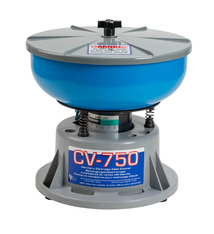 Le nettoyeur d'étuis vibrant CV-750 de Dillon est idéal pour les rechargeurs disposant d'un espace limité. Le bol du CV-750 mesure 30,5 cm de diamètre et l'appareil 30,5 cm de hauteur. Ce modèle est équipé d'un bol de 4,5 litres et peut traiter jusqu'à 500 étuis de calibre .45 ACP ou .38/.357, ou environ 200 étuis de calibre .30-06.